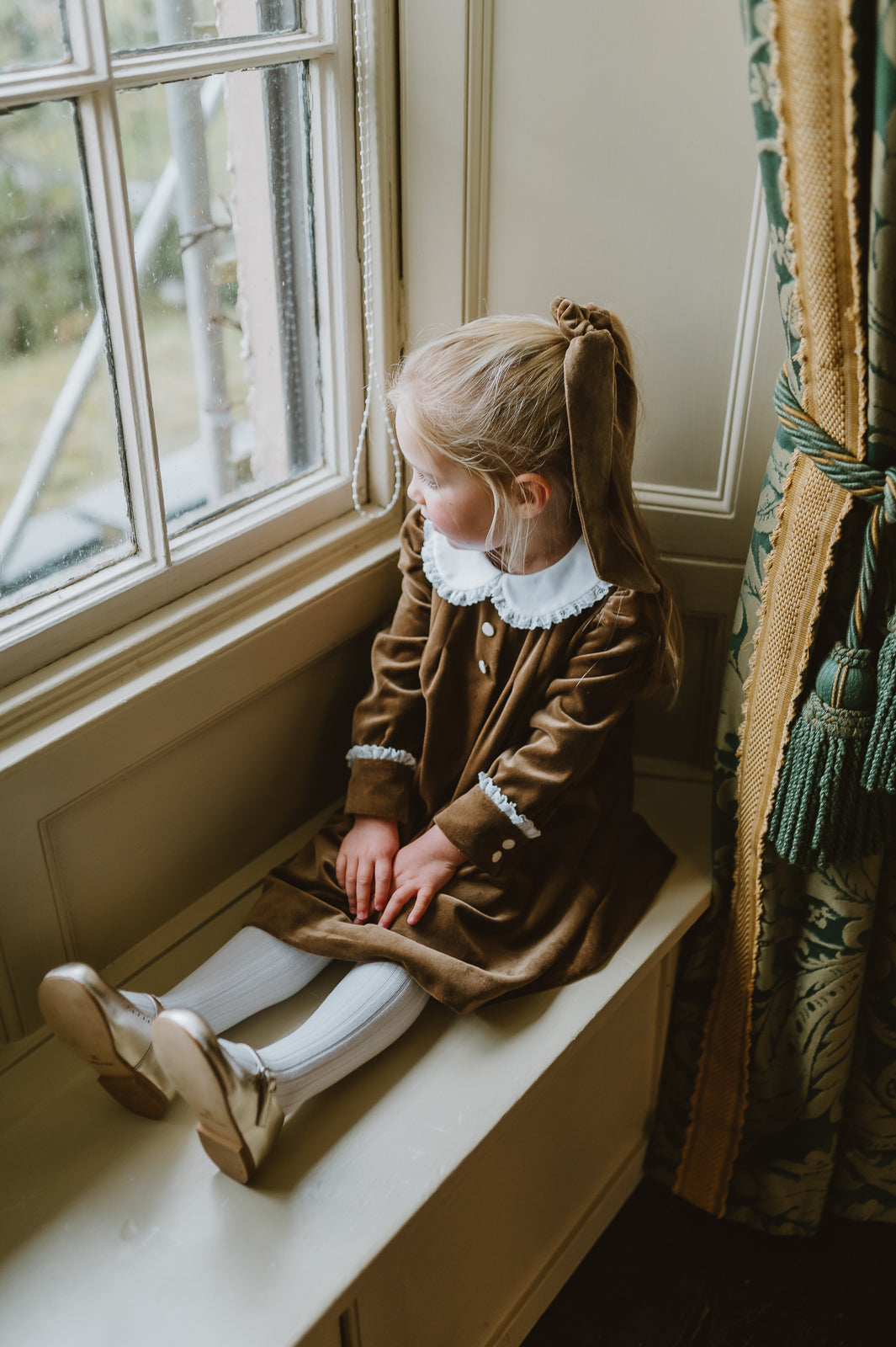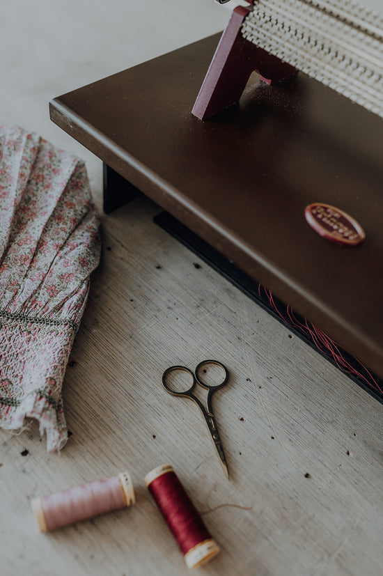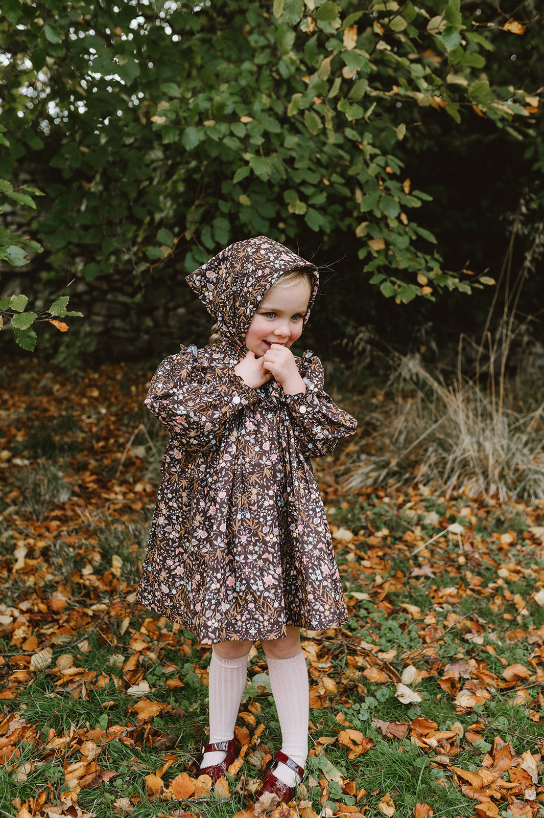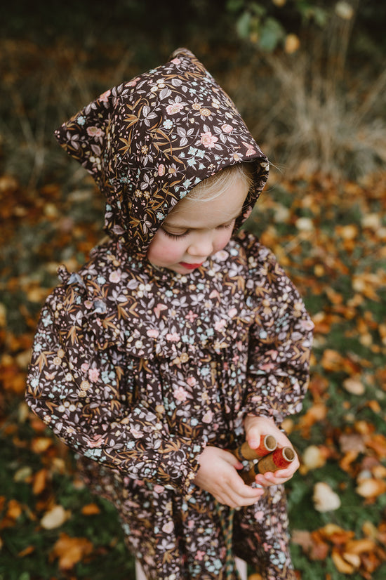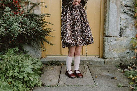 Our new collection is a trio of flowing dresses with an enchanting vintage feel. Velvet as soft as fall season and irresistible peter pan collars trimmed with British lace. Yokes on Liberty fabric, trimmed with ruffles inviting us to dance. Beautifully illustrated flowers complemented by elegant leaves and vibrant butterflies camouflaged perfectly with in the entwined leaves. Embroidery reminding us of a trellis walk.