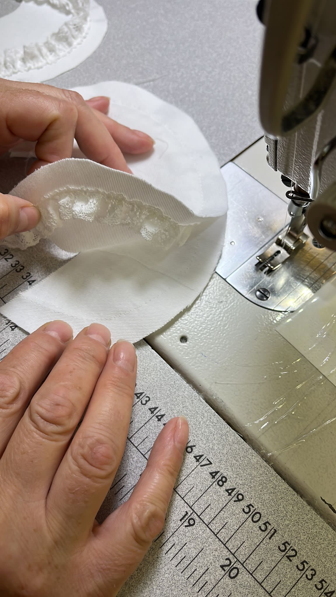 We contacted lovely Kate at Cluny lace in search for laces to match. Each sample from Cluny lace was carefully studied before a selection was made. Finding lace that matched or blended with the fabric and silhouette was the first challenge. We selected the FC53 1.7cm lace white that has one straight border and one scalloped edge with a central motif repeat. When it arrived, it was the perfect match!
