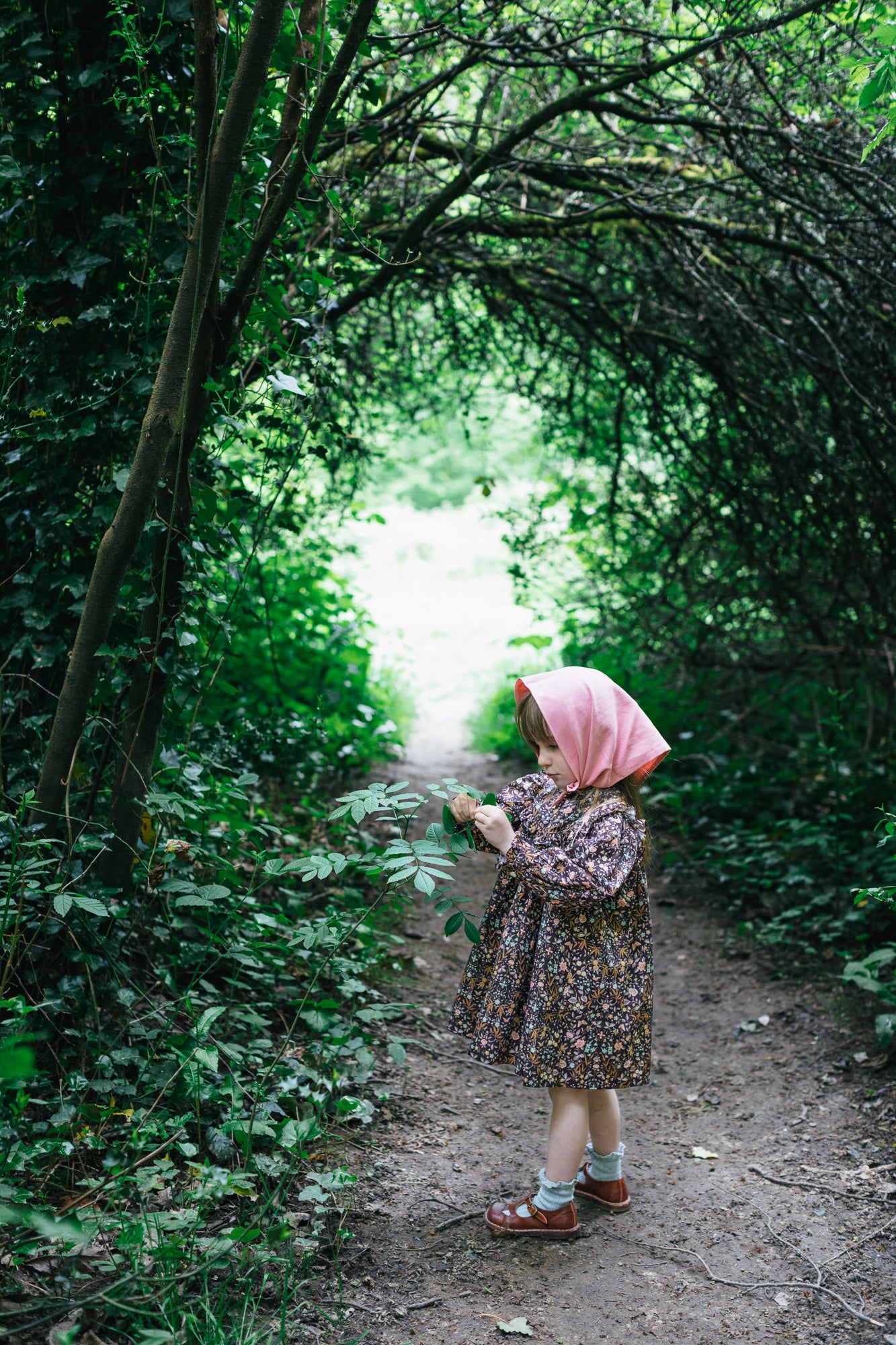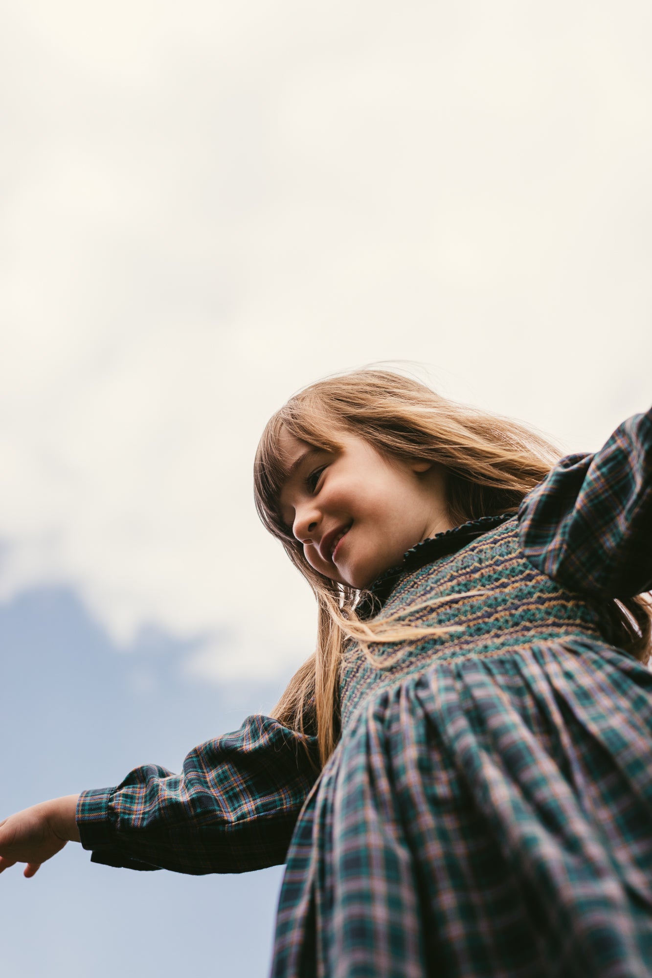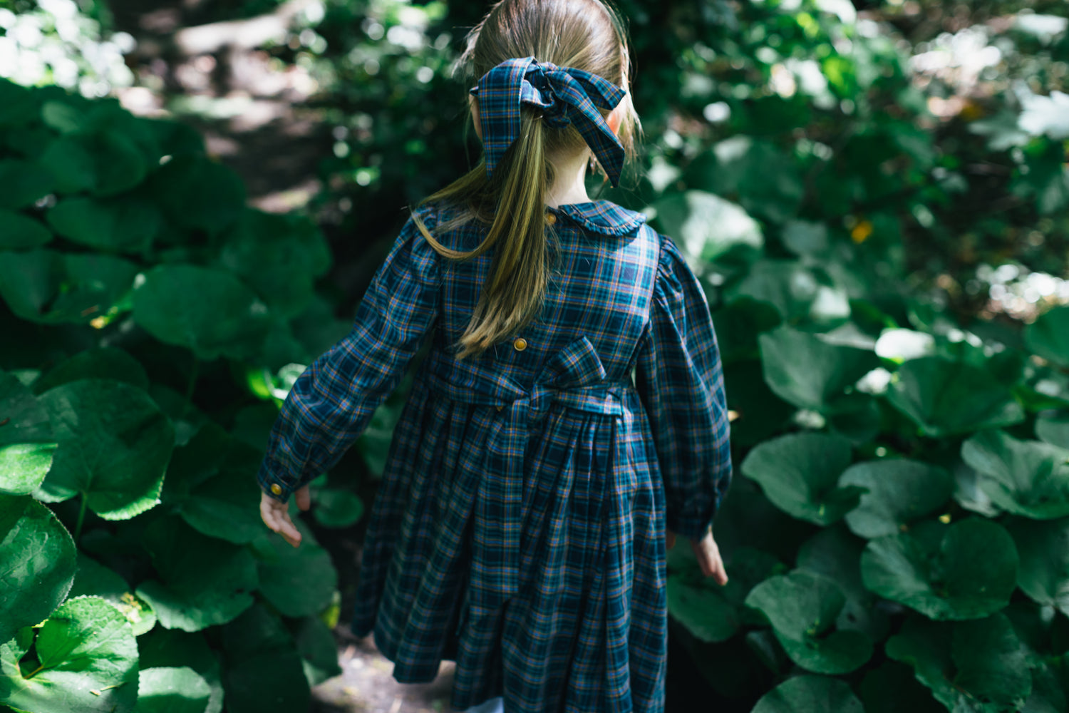 JK: Our capsule collection is a trio of flowing dresses with an enchanting, vintage feel. There are soft velvet and irresistible Peter Pan collars trimmed with British lace. Yokes on Liberty fabric trimmed with ruffles inviting us to dance. Beautifully illustrated flowers complemented by elegant autumn leaves. Vibrant butterflies camouflaged perfectly within the entwined leaves, with hand-smocked embroidery reminding us of a trellis spring walk. We create garments that have the potential to become heirlooms and design garments that last long after a child outgrows them, to be passed on to siblings, children and grandchildren. All our accessories are made consciously by artisans in Britain using leftover fabric. All our knitted pieces are created by artisans in Britain, too.